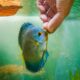 Żywy i suchy. Gatunek bez problemu przyjmuje pokarmy żywe, mrożone jak i sztuczne. Konieczny jest w diecie tych ryb również dodatek pokarmów roślinnych.