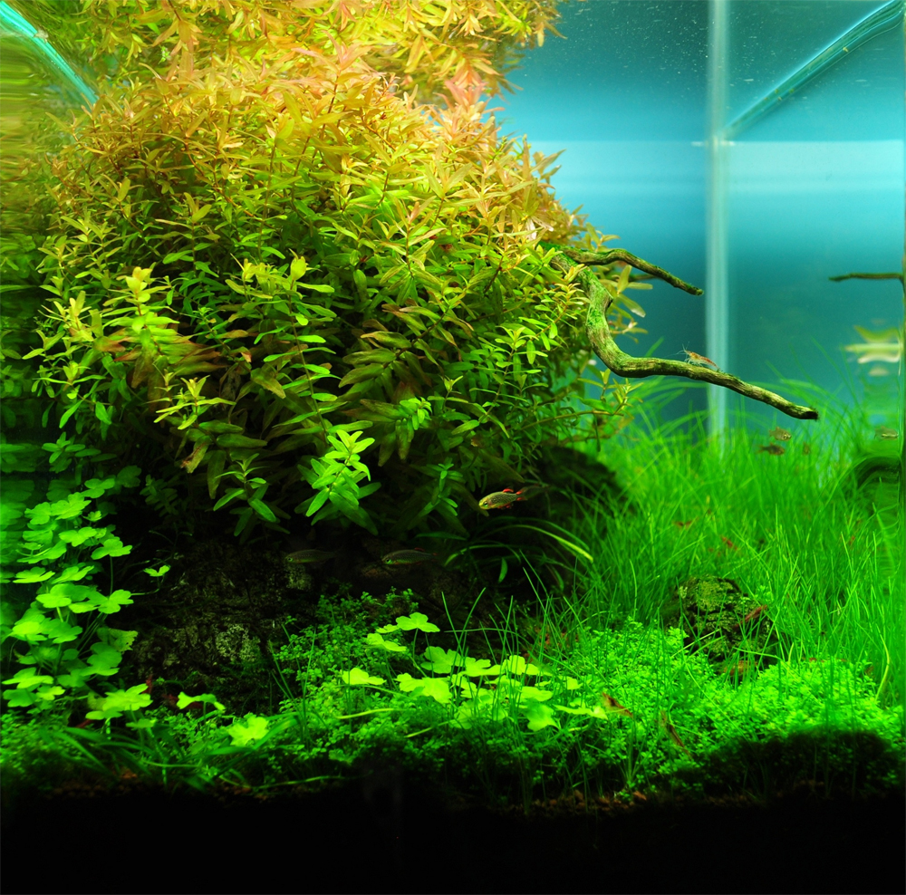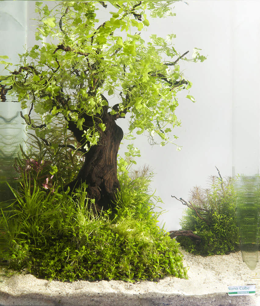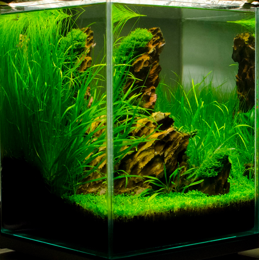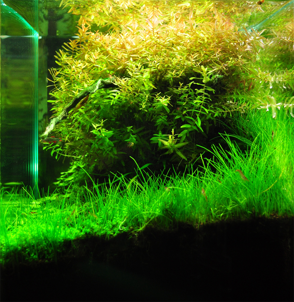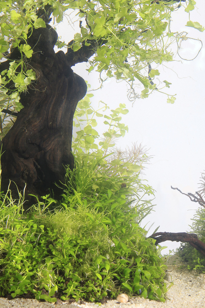 Rośliny: Anubias barteri var. nana Bonsai, Hemianthus callitrichoides Cuba, Cryptocoryne parva, Echinodorus tenellus rubra, Eleocharis acicularis, Eleocharis pysilii, Elatine hydropiper, Homalia sp. Rosa moss, Riccardia