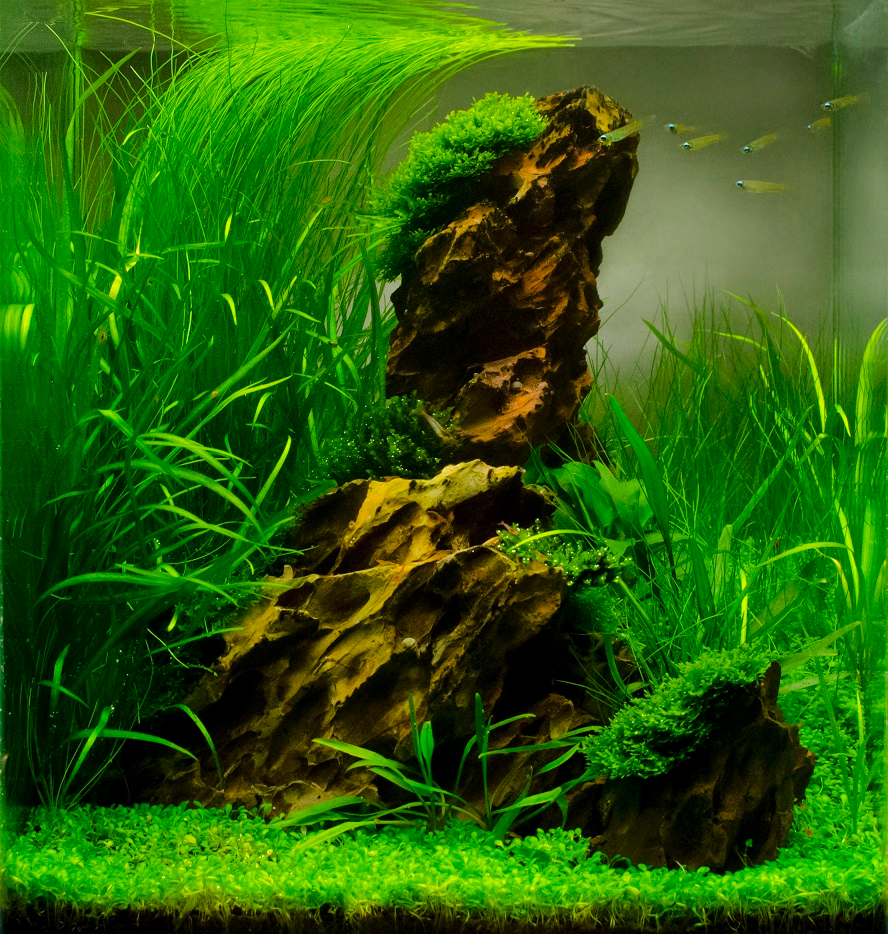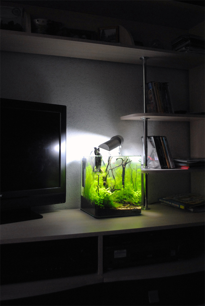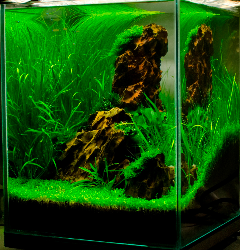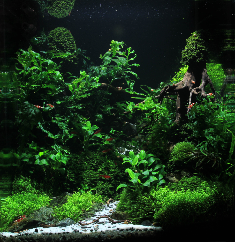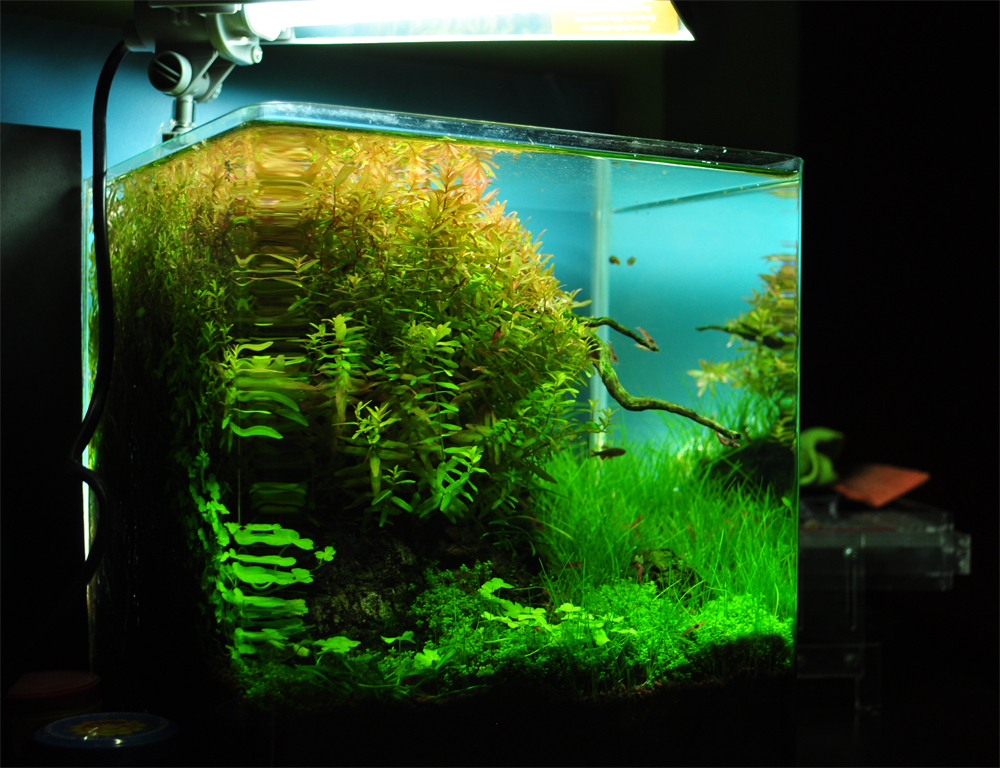 Rośliny: Anubias barteri var. nana Bonsai, Hemianthus callitrichoides Cuba, Cryptocoryne parva, Echinodorus tenellus rubra, Eleocharis acicularis, Eleocharis pysilii, Elatine hydropiper, Homalia sp. Rosa moss, Riccardia