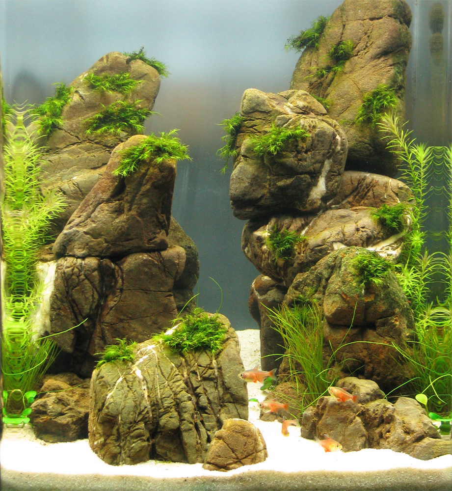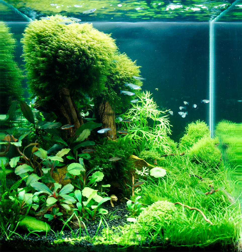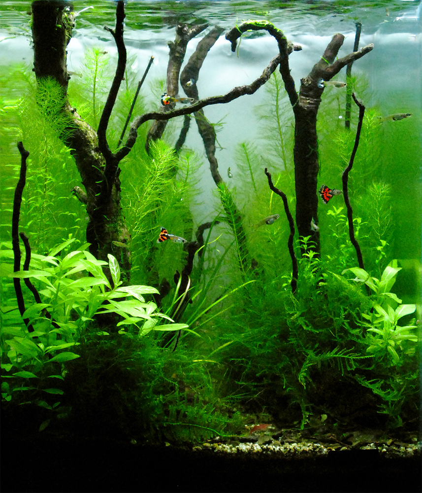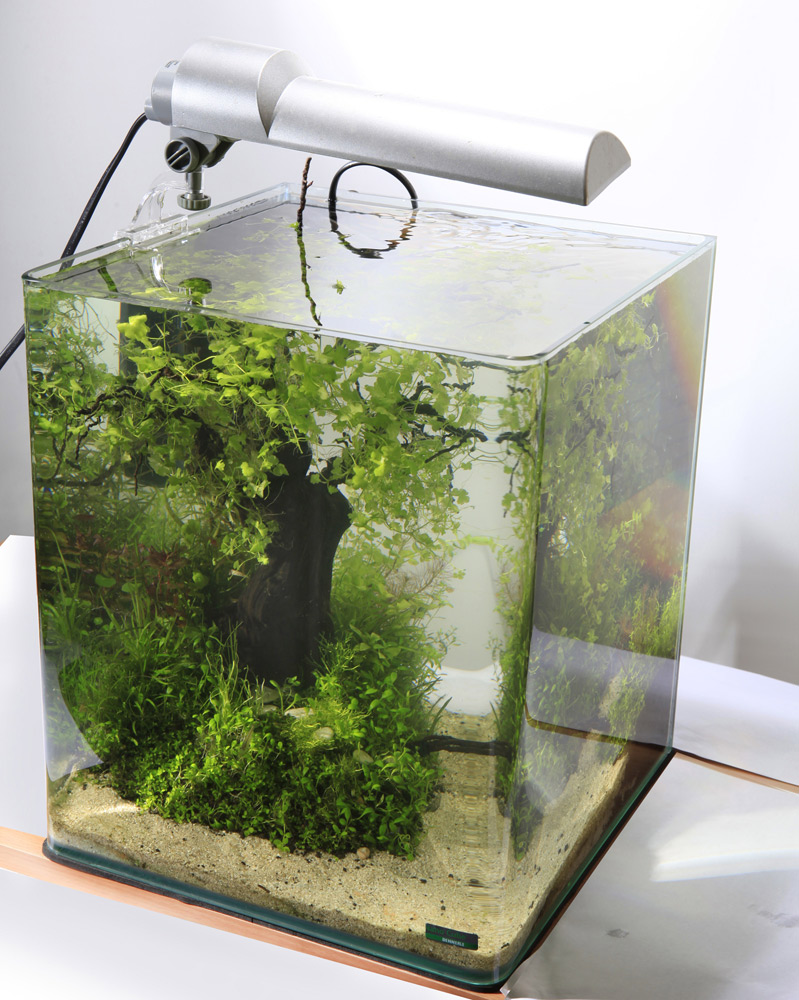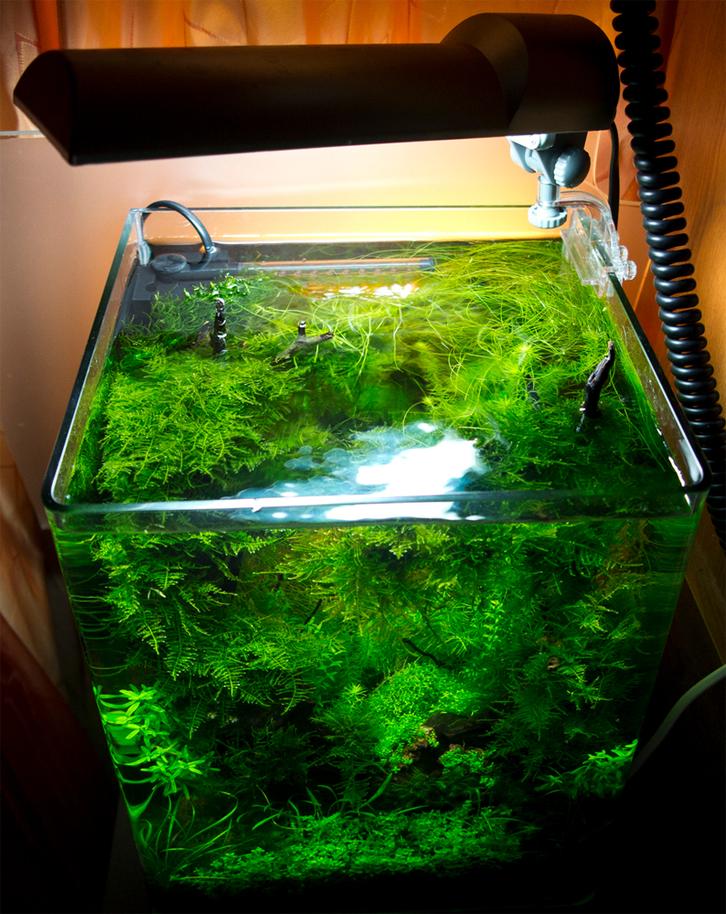 Rośliny: Anubias barteri var. nana Bonsai, Hemianthus callitrichoides Cuba, Cryptocoryne parva, Echinodorus tenellus rubra, Eleocharis acicularis, Eleocharis pysilii, Elatine hydropiper, Homalia sp. Rosa moss, Riccardia