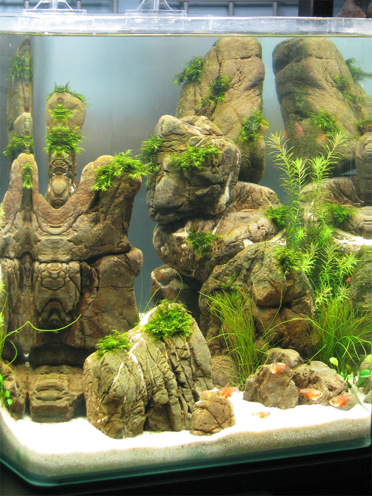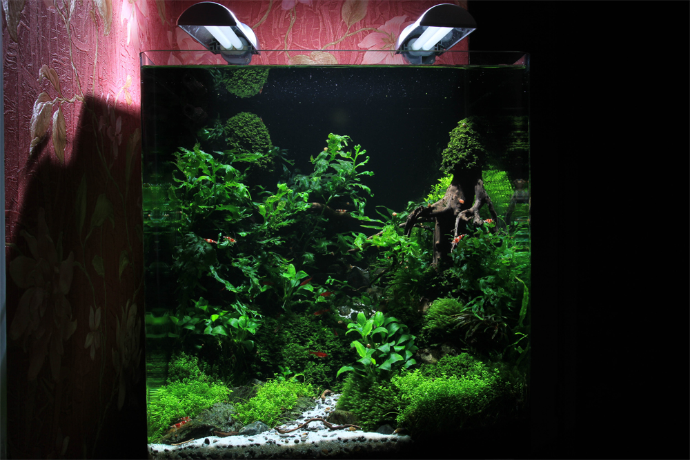 Rośliny: Eleocharis parvula, Hemianthus callitrichoides “Cuba”, Vesicularia dubayana, Flame Moss Taxiphyllum sp., Pogostemon erectus, Vallisneria nana, Crinum calamistratum