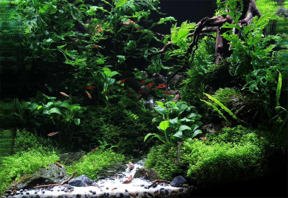 Rośliny: Vesicularia montagnei, Taxiphyllum sp., Phoenix moss, Riccia, Mayaca fluviatilis, Micranthemum umbrosum, Micranthemum sp. Monte Carlo, Hemianthus callitrichoides cuba, Eleoharis vivipara, Eleocharis parvula, Cryptocoryne parva, Lilaeopsis brasiliensis