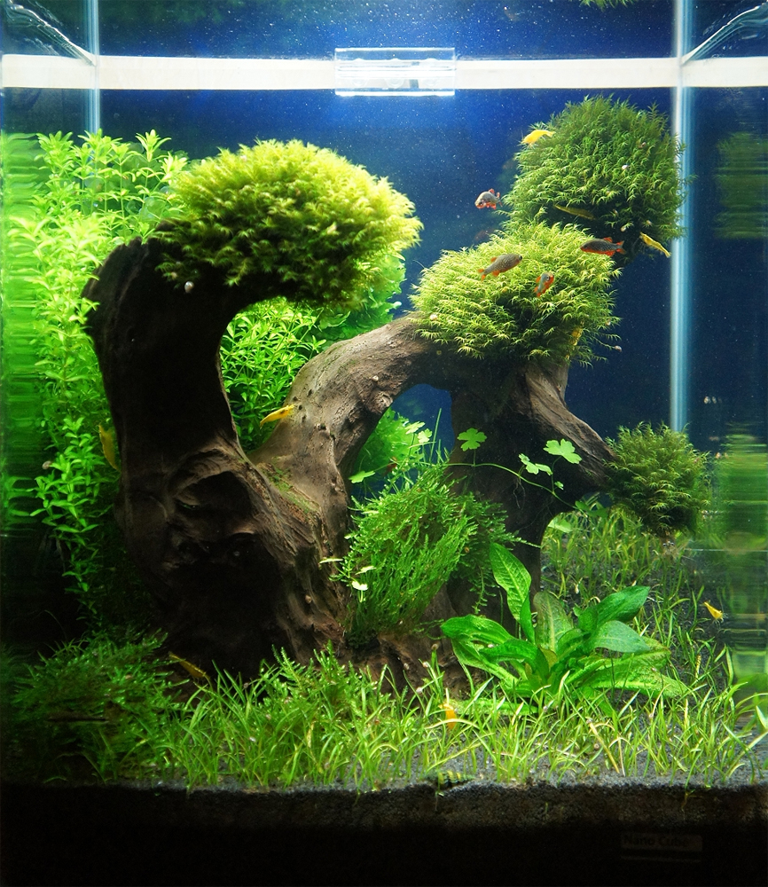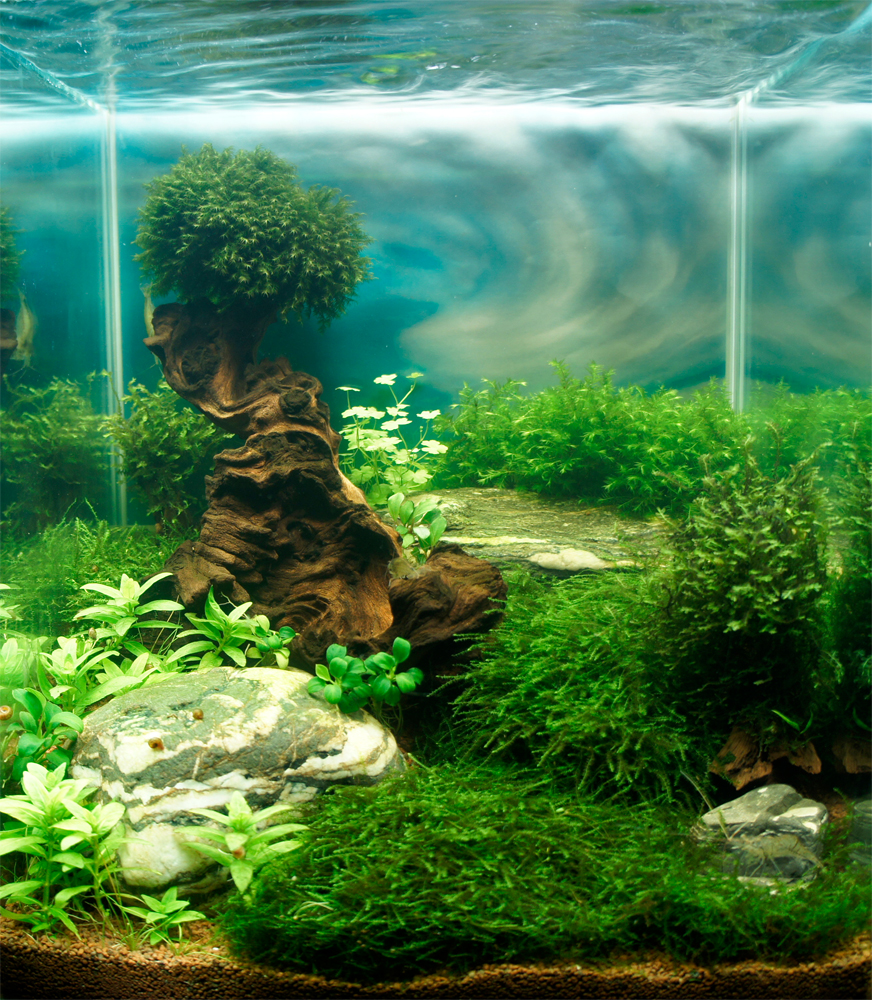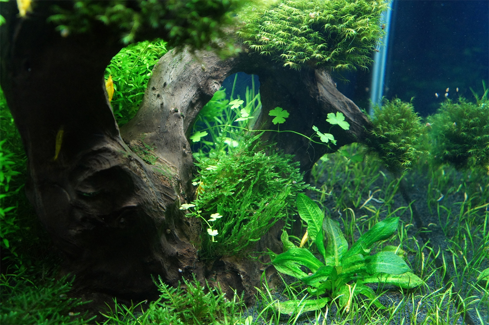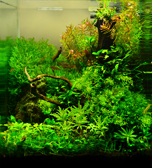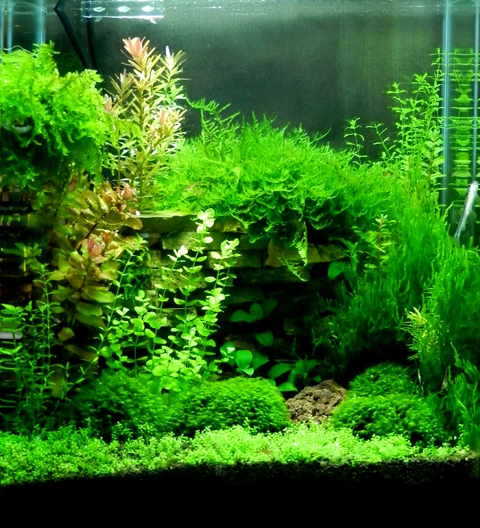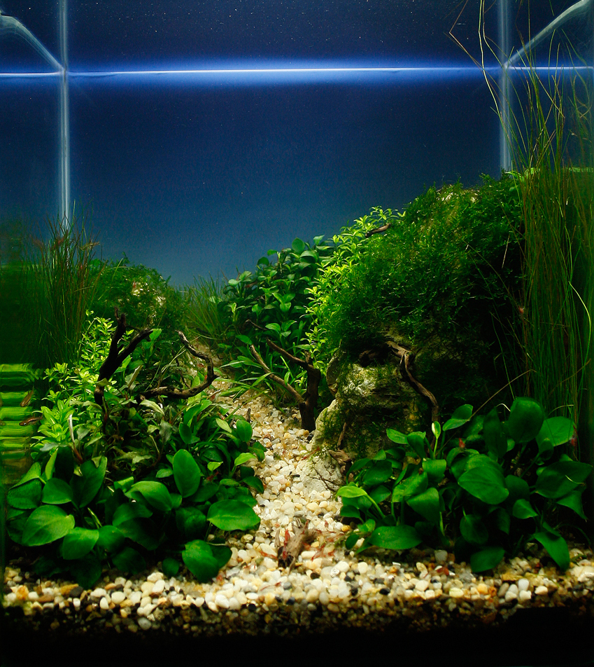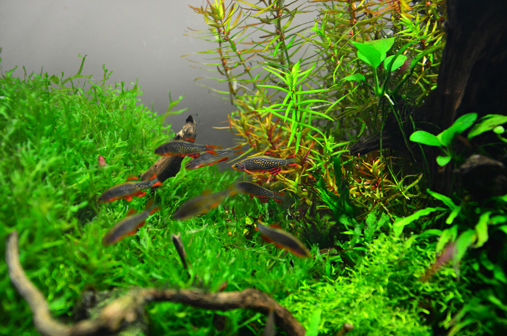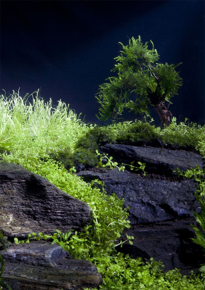 Rośliny: Flame moss, Christmas moss, Fissidens fontanus, Riccardia chamedryfolia, Weeping Moss, Anubias nana, Rotala indica, Rotala macrandra, Hemianthus callitrichoides cuba, Micranthemum umbrosum, Hemianthus micranthemoides