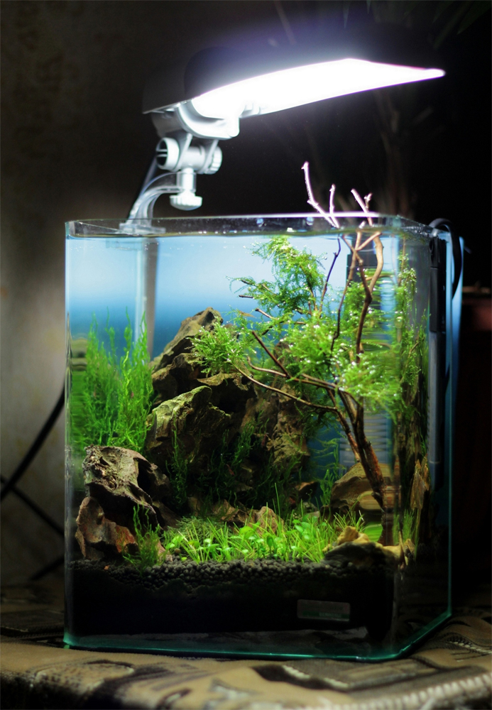 Rośliny: Anubias barteri var. nana, Anubias barteri var. nana “Variegata”, Anubias barteri var. nana “petite”, Eleocharis acicularis, Eleocharis parvula, Vesicularia sp., Staurogyne repens, Ammania sp. Bonsai, Hemianthus micranthemoides, Bucephalandra sp. Shine Blue, Bucephalandra sp. Velvet Leaf, Bucephalandra sp. Kedagang, Cryptocoryne sp., Cryptocoryne parva