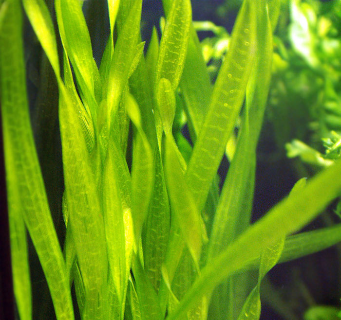 Liście barwy intensywno-zielonej, delikatnie poskręcane, o ząbkowanych brzegach. Osiągają długość od 20 do 25 cm i szerokość do 8 mm. Gatunek dobry do większości akwariów, ponieważ najczęściej dorasta tylko do powierzchni wody. Lubi żyzne podłoże. Liście pokrywające się żółtymi plamkami zaczynają obumierać. Roślinę można wykorzystać, w zależności od wielkości zbiornika, w mniejszych jako tylne tło, w większych zaś do obsadzenia boków, a także środka.