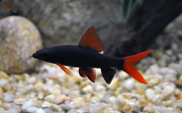 Miejscami gęsta obsada roślin jak również dużo miejsca do pływania. Potrzebuje dużo kryjówek z kamieni i korzeni. Większe egzemplarze są dosyć niezgodne i agresywne. Zaleca się trzymanie z większymi rybami. Nie polecany dla początkujących akwarystów, ze względu na skłonności tej ryby do chorób. Dekoracje z korzeni i kamieni. Idealnie nadają się rzeczne otoczaki. Najlepiej zastosować ciemnie dno i kontrastujące kamienie. Jednak nie za jasne. Czarne ryby z czerwonym ogonem pięknie prezentują się właśnie w tak wystrojonym zbiorniku. Akwarium powinno być szczelnie przykryte, ponieważ ryby mogą z niego wyskakiwać. Wymaga dobrej filtracji wody oraz napowietrzenia wody.