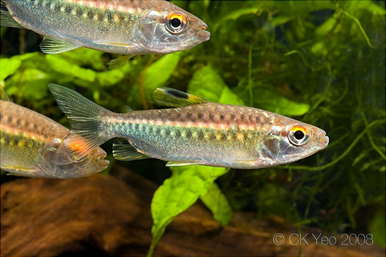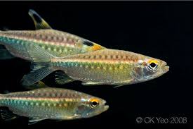 Samce posiadają wypukłą płetwę odbytowa z czerwonymi, żółtymi i czarnymi paskami. U samic płetwa odbytowa jest prosta i posiada czarną plamkę.