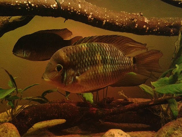 Dojrzałość płciowa ryby osiągają w wieku 10-12 miesięcy i długości około 8 cm. Tarło można zastymulować poprzez częściową podmianę wody w akwarium. Temperatura 24-28°C, woda bardzo miękka i kwaśna. Ikra składana na korzeniach w ilości do 200 ziaren. Larwy wylęgają się po około 3 dniach. Rodzice troskliwie opiekują się potomstwem. Karmienie narybku powinno się rozpocząć planktonem w 6-9 dniu od wyklucia, następnie larwami solowca.