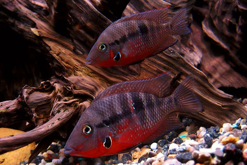 Samiec i samica żyją w związku monogamicznym, czyli para pozostaje ze sobą na zawsze. Dlatego należy zadbać, aby para dobrała się sama i nie zostały rozdzielone. Przed tarłem zarówno samiec, jak i samica stają się bardzo agresywni. Ikra składana jest w grotach skalnych, na kamieniach i łupinach orzecha kokosowego. Jej ilość to 100-500 ziaren ikry. Rodzice bardzo troskliwie opiekują się potomstwem. Wylęg po około 2-3 dniach. Jest dość duży i chętnie przyjmuje drobny pokarm. W przypadku karmienia rodziców suchymi płatkami, potrafią oni rozdrobnić pokarm na pył i “karmić” młode. Po wykluciu narybek przenoszony jest do wcześniej przygotowanych dołków. Rodzice bardzo troskliwie opiekują się potomstwem odganiając potencjalnych wrogów. Schronieniem dla młodych jest też pysk rodziców. W momencie zagrożenia młode chowają się niego, co jest bardzo widowiskowe.