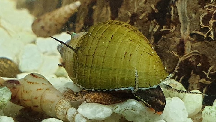 Aktywne ślimaki w ciągu dnia, jak i nocą. Pomimo że jest to gatunek typowo nocny, to bez problemu w akwariach widać go w ciągu dnia w poszukiwaniu pożywienia. Najedzony zakupuje się w podłożu. Ślimaki dość często wychodzą z akwarium i dlatego musi być ono szczelnie przykryte.